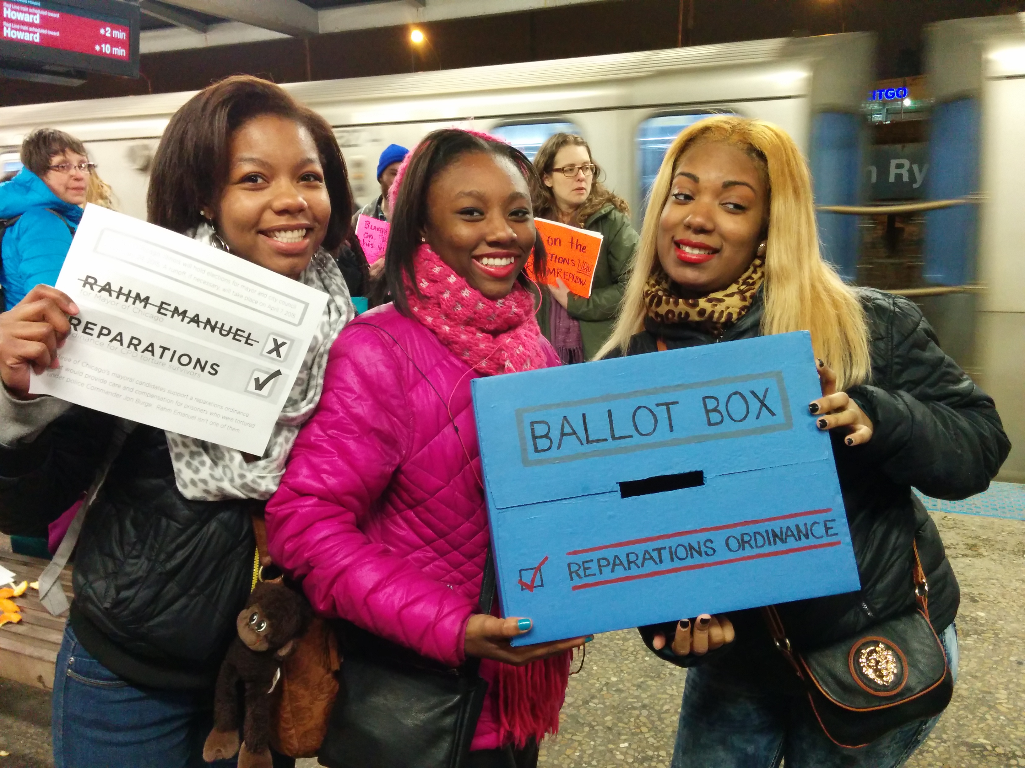Last night, a group of activists and allies took to the subway in Chicago to make some noise about this week’s election and the much discussed reparations ordinance. The ordinance, which would provide care and compensation to individuals tortured by Chicago police under Jon Burge, will not be on the ballot, but the man who has prevented it from getting a hearing before the City Council will be: Mayor Rahm Emanuel.