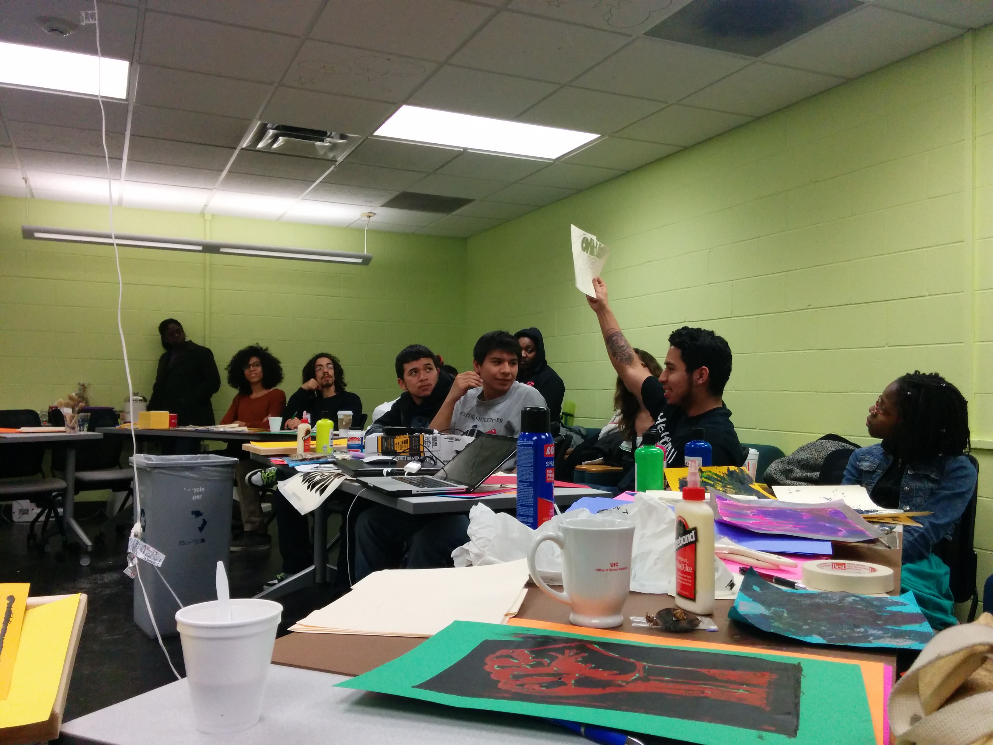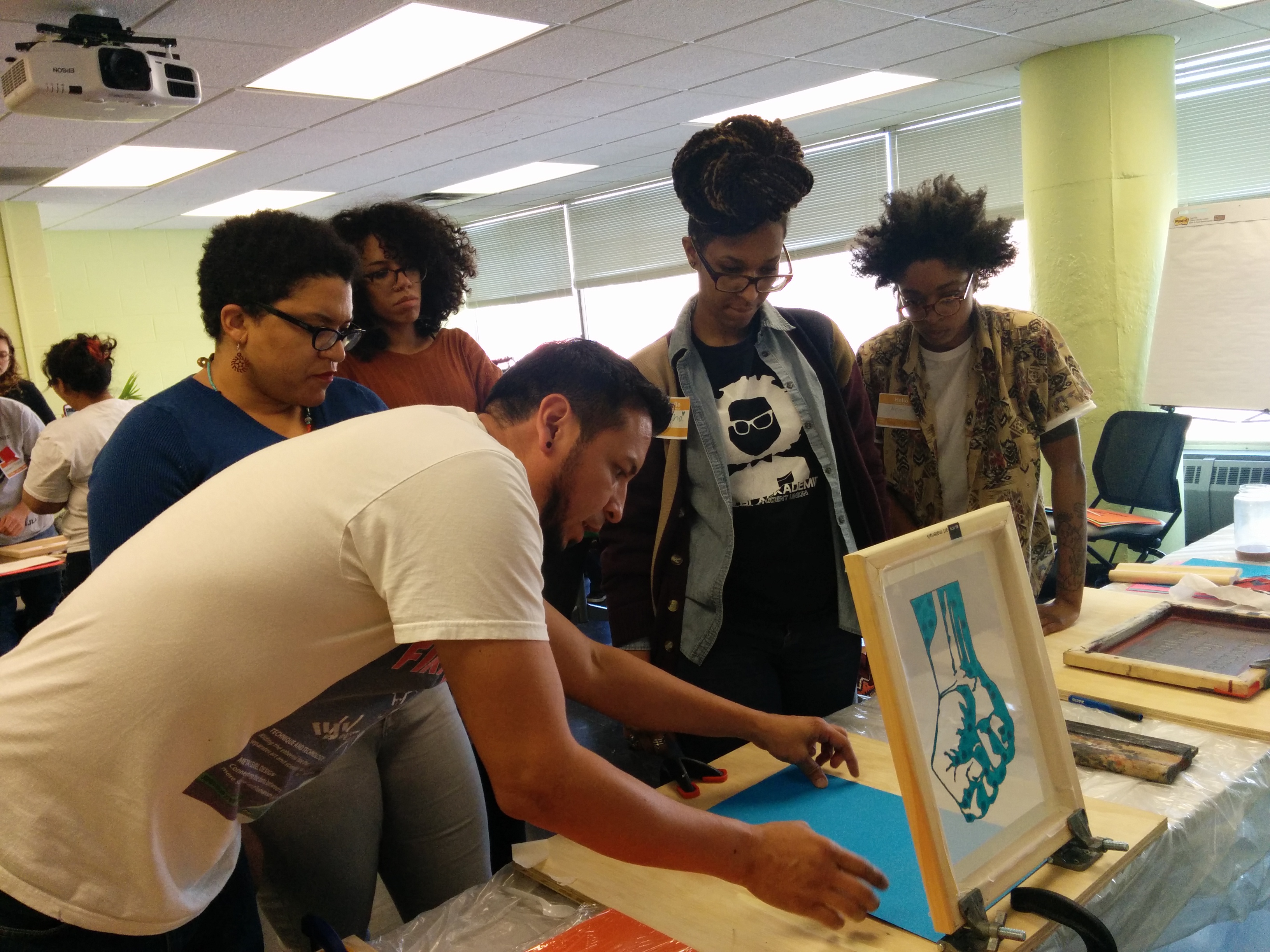 This weekend was the first installment of this new working model. Our friend Remy, an indigenous arts and resistance trainer with the Ruckus Society, flew in from Arizona to co-facilitate a weekend-long workshop on artful protest tactics. He teamed up with a local trainer to build a curriculum that built on local strengths and allowed learners to experiment with new tactics. Participants engaged in dialogues about their collective vision and practiced screen printing, block printing, banner making, and prop building techniques. They also explored the ways in which art manifests itself in the storytelling of movements. With over 20 participants, two full days of learning, and four meals to serve, the event was a massive undertaking. Fortunately, the community rallied around its success with donated time, materials, food, and funds.