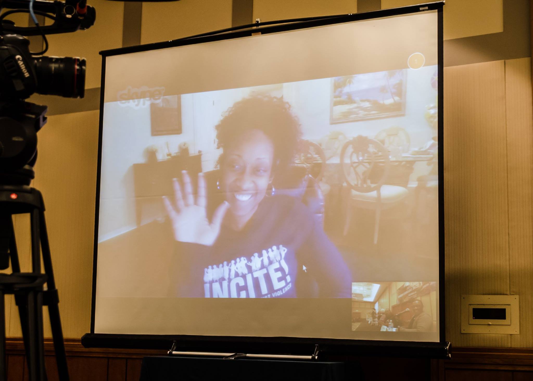For me, the most emotional moment of the night was seeing Marissa Alexander’s face appear on a projector screen to join us via Skype. I saw a number of pictures of Marissa over the course of her legal battle, in which she was criminalized for choosing to survive an act of domestic violence, but I had never seen her smile.