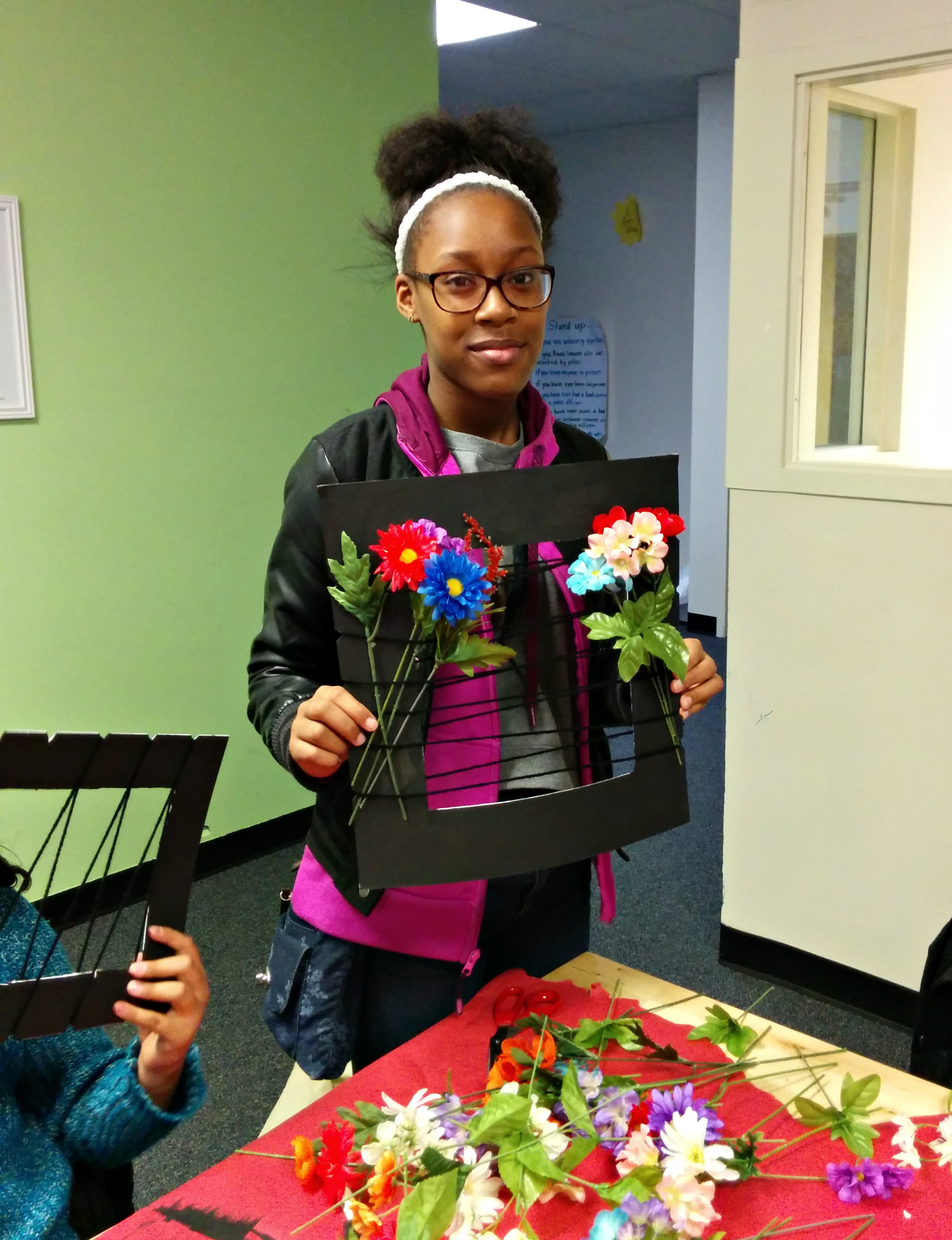 The looms the young people made are cut from cardboard. They were painted black and woven with yarn. The black cardboard and yarn represent a jail cell – a universal symbol of state violence. The flowers students wove into the yarn represent all of us – the resistors, the organizers, those who survive the violence of the state, and those who support the survivors – and the communities, achievements and relationships that we have built in struggle. They represent the changes that will be brought by the ordinance when that fight is won – including forcing the truth of Chicago Police torture under Jon Burge into the CPS curriculum. The flowers emerging from between the bars are what we build in spite of the state, and in defense of our own humanity. They are a manifestation of what my friend Mariame Kaba would call the discipline of hope.