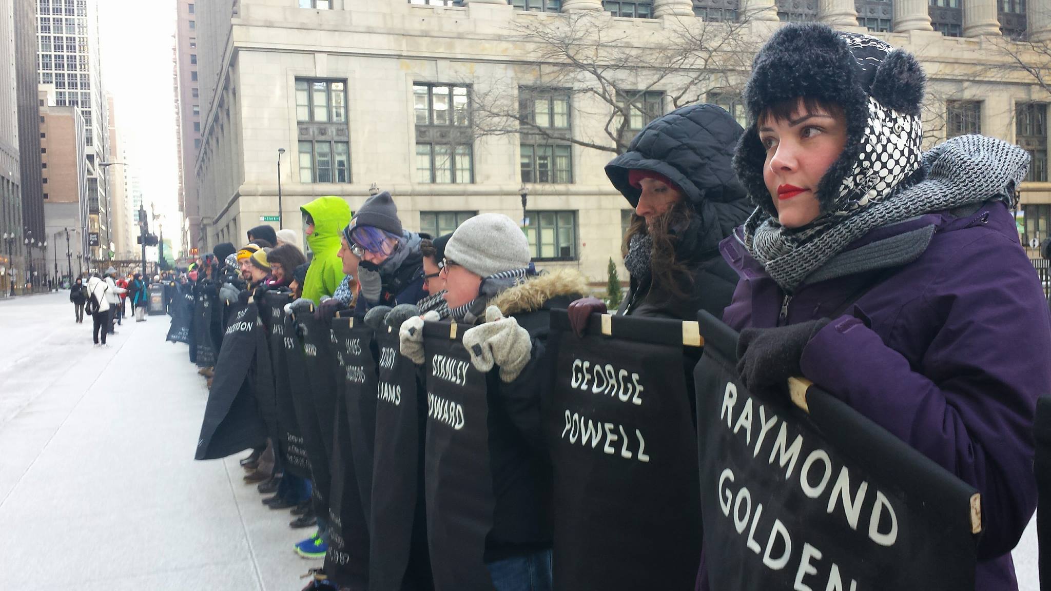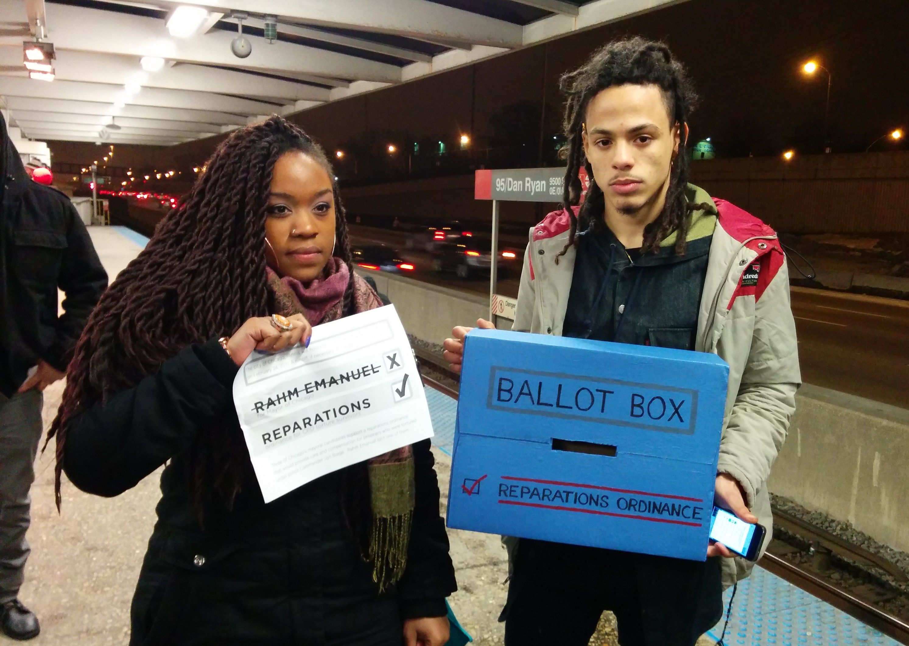 Outside Rahm Emanuel’s house demanding reparations for CPD torture survivors. (Photo: Kelly Hayes)After holding up their message directly in front of Rahm Emanuel’s home, activists crossed the street to make sure the mayor could clearly read the light banner from his window. Lights went on at the front of the house during the protest. Rahm Emanuel was reportedly home at the time. (Photo: Kelly Hayes)In February, on the eve of the mayoral election, a group of young women joined train takeover protestors at the 95th Street Station after hearing organizers explain the reparations ordinance. (Photo: Kelly Hayes)(Photo: Kelly Hayes)(Photo: Kelly Hayes)A train takeover on the eve of the mayoral election in February. (Photo: Kelly Hayes)A recent living memorial for victims of police torture under Jon Burge lined an entire city block. (Photo: Kelly Hayes)(Photo: Kelly Hayes)(Photo: Kelly Hayes)(Photo: Kelly Hayes)(Photo: Kelly Hayes)(Photo: Sarah Jane Rhee)(Photo: Sarah Jane Rhee)(Photo: Sarah Jane Rhee)(Photo: Sarah Jane Rhee)(Photo: Brit Schulte)(Photo: Kelly Hayes)(Photo: Kelly Hayes)Burge torture survivor Mark Clements leads a teach-in about the fight for justice for CPD torture survivors. (Photo: Kelly Hayes)Visitors examine the photo section at the City Hall exhibition-in for reparations. (Photo: Kelly Hayes)Students from The Village Leadership Academy stand in protest. (Photo: Kelly Hayes)At the close of the exhibition-in event at City Hall. (Photo: Sarah Jane Rhee)